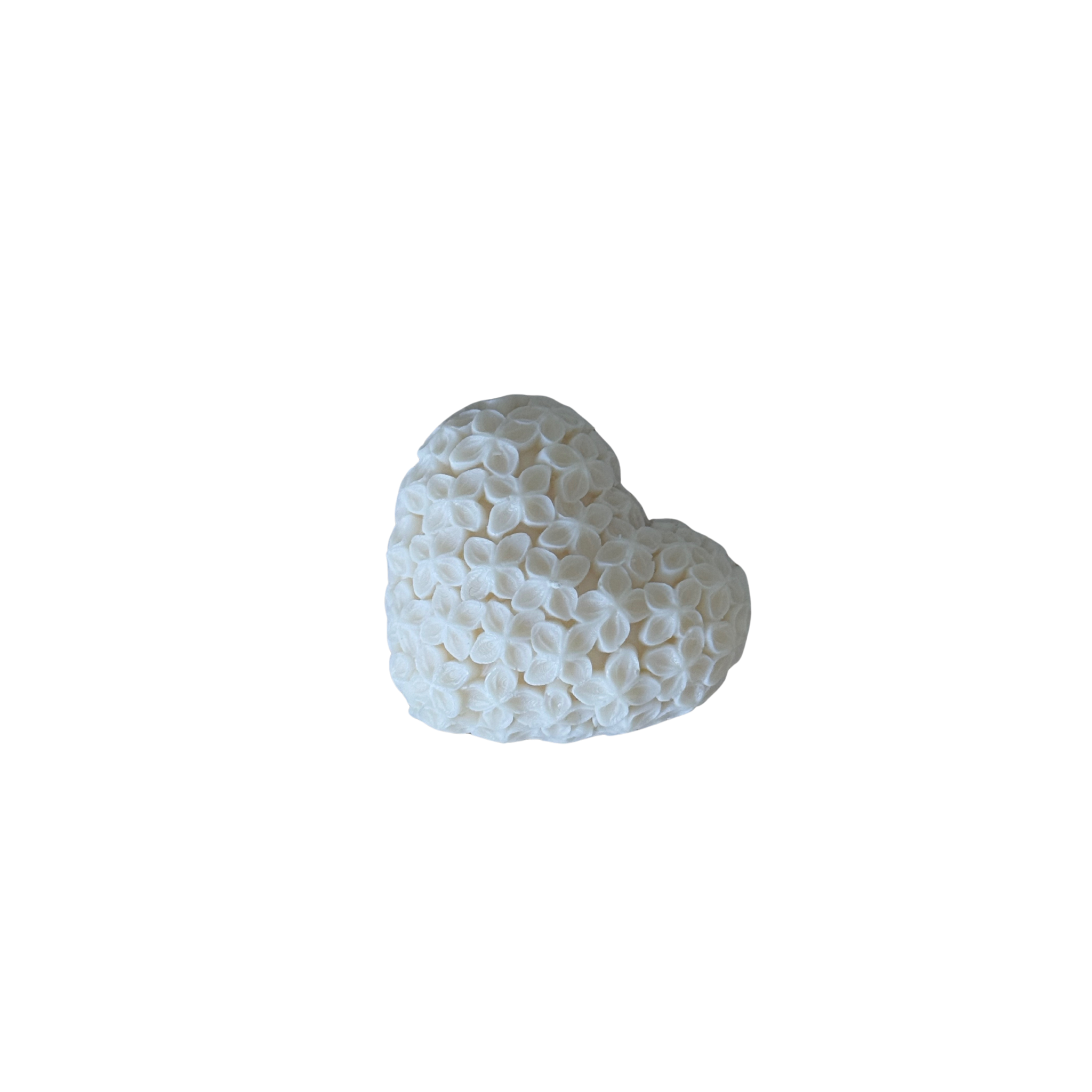 Świeca w kształcie serca z delikatnym, kwiatowym wzorem, minimalistyczna. Pasuje do spokojnych wnętrz i prostych aranżacji.
