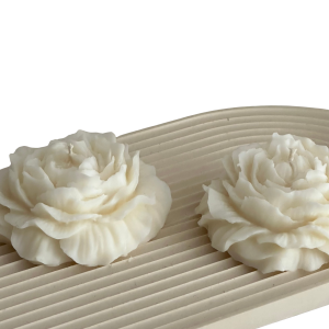 Świeca w kształcie piwonii. Delikatna, kwiatowa forma, która bardziej przypomina małą rzeźbę niż klasyczną świecę. Jasna, spokojna, dobrze wpisuje się w minimalistyczny wystrój.
